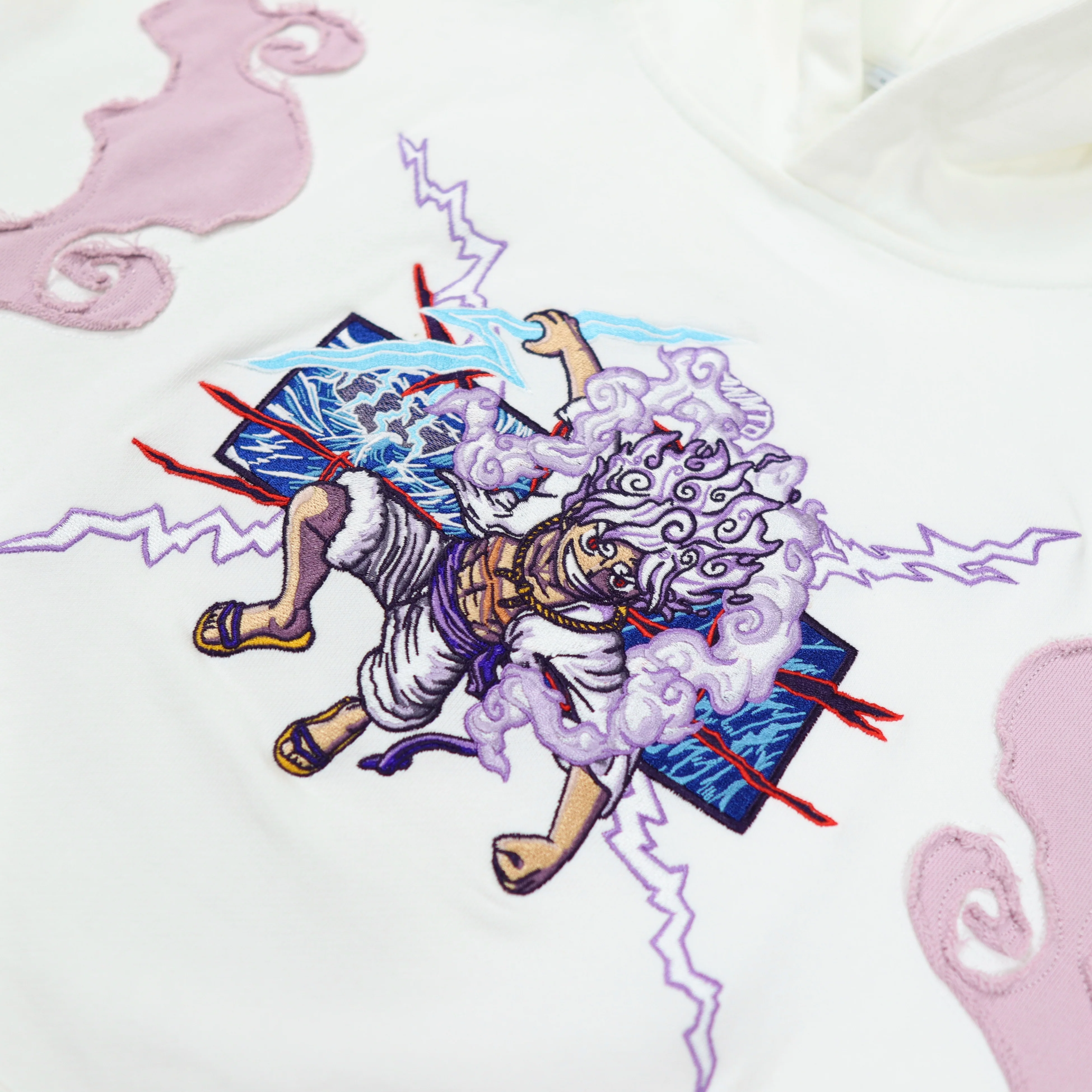 The design is fully embroidered on this premium custom cut and sew heavyweight French terry hoodie. Besides the font embroidery, it also features fabric-cut smoke on the front to mimic the look of the form as well as more fabric-cut designs on the sleeves and back! The hoodie fabric is very high quality and it is very breathable and flexible with a unique texture on the inside.